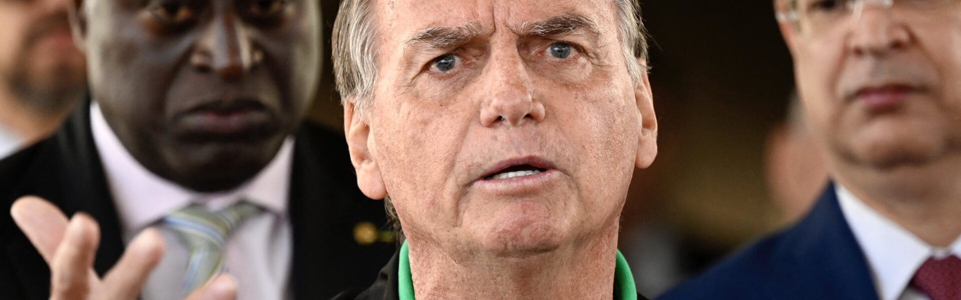 Former Brazilian President Jair Bolsonaro speaks to the press at the Federal Senate in Brasilia on July 17, 2025.