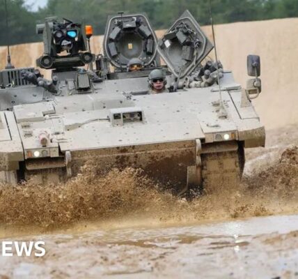 Driscoll is joined by the US Army’s chief of staff Gen Randy George, top US army commander in Europe Gen Chris Donahue, and Srg Maj of the Army Michael Weimer.